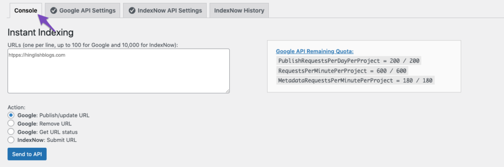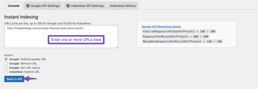 इंस्टेंट इंडेक्सिंग सेक्शन में एक URL (या अधिक) डालें, और क्रिया को Google: पब्लिश/अपडेट URL के रूप में चुनें। फिर, Send to API बटन पर क्लिक करें।
