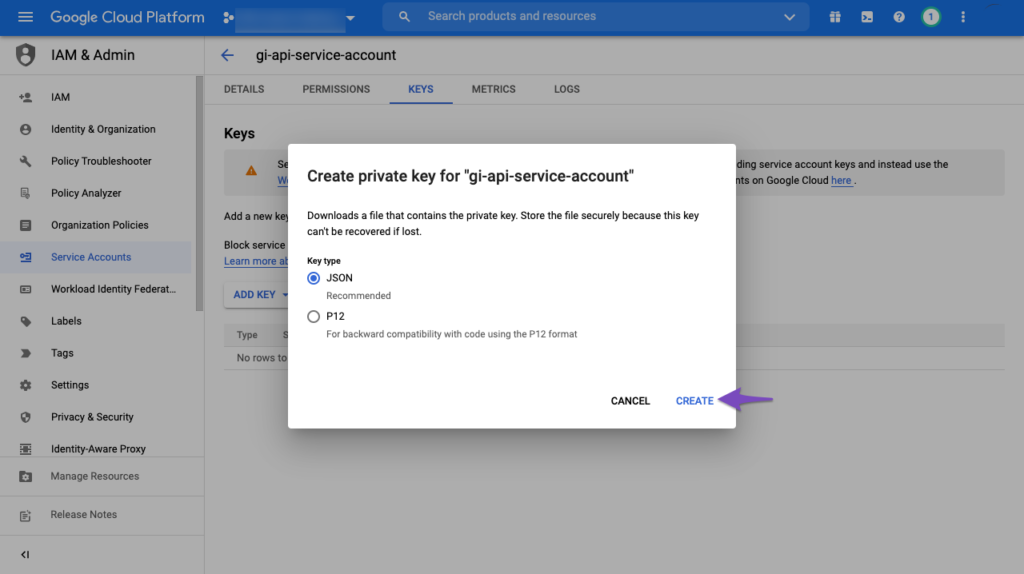 Service Account के लिए नया JSON कुंजी बनाएं
