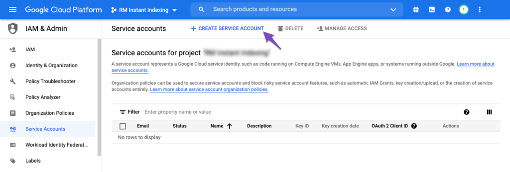 जिस प्रोजेक्ट के लिए आप सेवा खाता बनाना चाहते हैं, उसे चुनने के बाद, आपको निम्न पृष्ठ पर ले जाया जाएगा। यहां आपको केवल नीचे हाइलाइट किए गए Create Service Account बटन पर क्लिक करना है:
