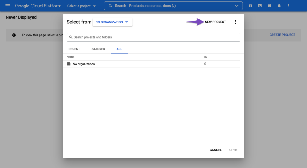 वैकल्पिक रूप से, आप Select a project ड्रॉप-डाउन पर क्लिक कर सकते हैं और स्क्रीन पर दिखाई देने वाले पॉपअप से New Project चुन सकते हैं।