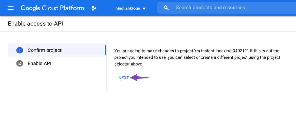 प्रोजेक्ट बनाने के बाद, आपको एपीआई तक पहुंचने के लिए प्रोजेक्ट को सक्षम करना होगा। अगले चरण में, आपको नीचे दिखाए गए अनुसार एक स्क्रीन दिखाई देगी। पुष्टि करें कि चयनित प्रोजेक्ट वही है जिसे हमने Instant Indexing API के लिए बनाया है, अन्यथा, परियोजना बदलने के लिए ऊपर दिए गए ड्रॉप-डाउन का चयन करें। एक बार जब आपने प्रोजेक्ट का चयन कर लिया, तो Next पर क्लिक करें।