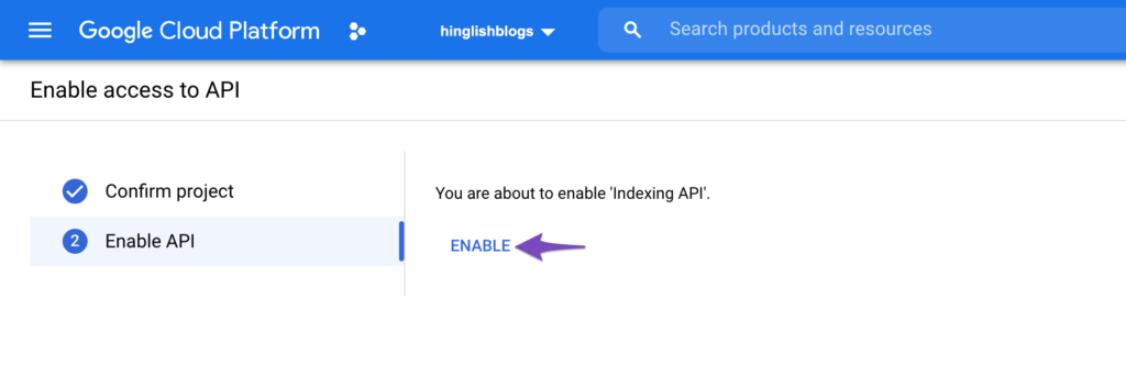 अगले चरण में, Instant Indexing API तक पहुंचने के लिए प्रोजेक्ट को सक्षम करने के लिए Enable विकल्प पर क्लिक करें।