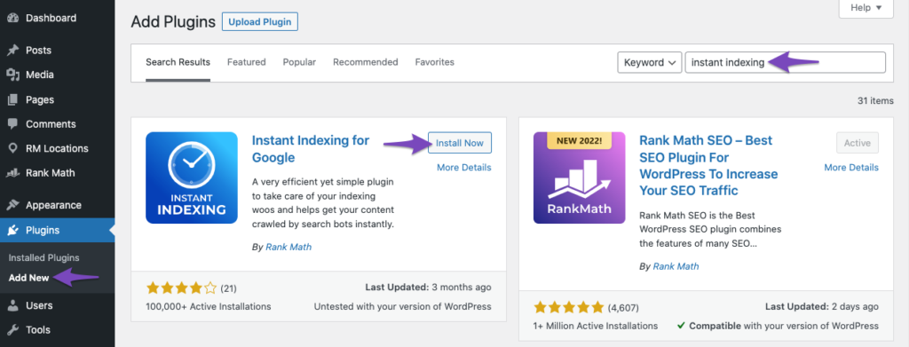 या फिर, आप इसे WordPress व्यवस्थापक पैनल के माध्यम से भी इंस्टॉल कर सकते हैं। Plugins → Add New पर जाकर Instant Indexing प्लगइन खोजें और इंस्टॉल करें, जैसा कि नीचे दिखाया गया है।