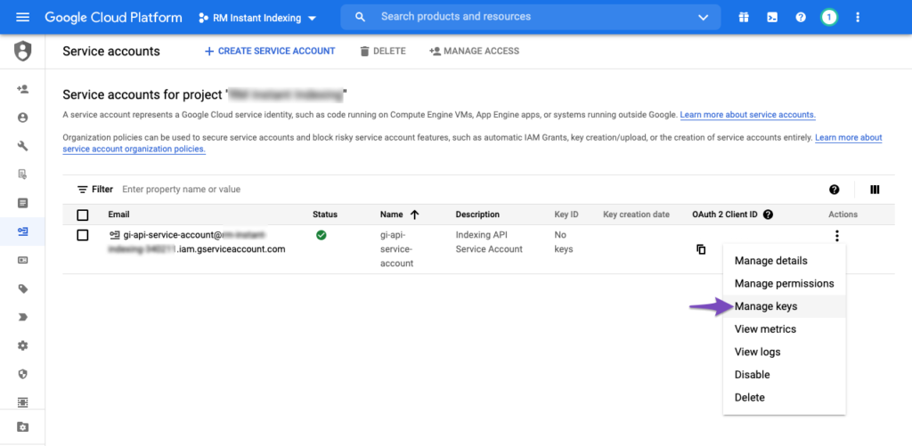 इसके बाद आप उस फ़ाइल को डाउनलोड कर सकते हैं जिसमें आपकी API कुंजी होती है। ऐसा करने के लिए, Actions कॉलम में तीन लंबवत बिंदुओं पर क्लिक करें और फिर नीचे दिखाए अनुसार Manage keys विकल्प चुनें: