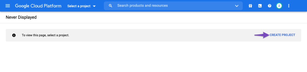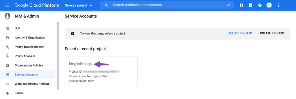 एक नया प्रोजेक्ट बनाएं Create Project विकल्प पर क्लिक करके सुनिश्चित करें कि आप एक नया Indexing API प्रोजेक्ट बना रहे हैं।