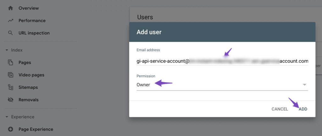 Google Search Console में अपने सेवा खाते को अपने Google Search Console प्रॉपर्टी के मालिक के रूप में जोड़ें
